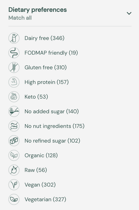 You can easily filter all our snacks by dietary preferences. You can even specify more than one. For example, if you select 'Vegan' and 'Organic', you will only see snacks which are both Vegan and Organic.