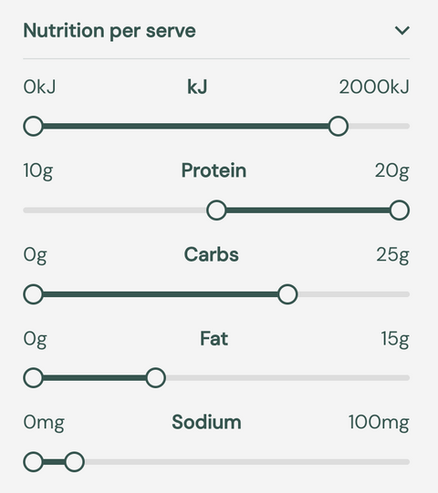 You can filter our snacks based on your exact nutritional requirements. For example, you could say "I only want to see snacks under 2000kJ, with at least 10g protein, less than 25g carbs, under 15g fat and less than 100mg of Sodium".